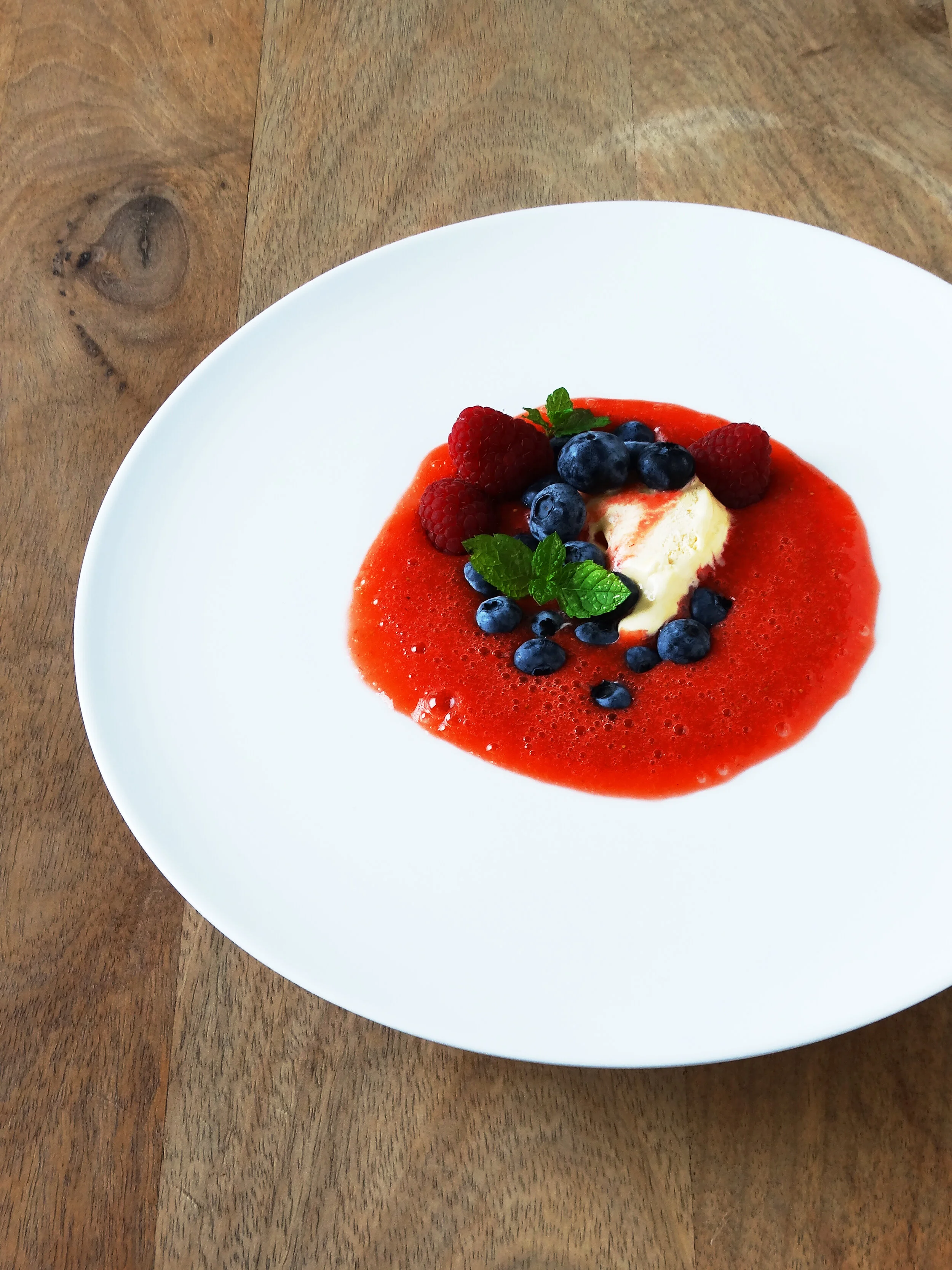 Mix een bakje rijpe aardbeien met de andere helft van de siroop en wat limoensap tot een soepje. Proef of het zoet genoeg is. Verdeel over vier diepe borden, en lepel in het midden wat van de kersengranité. Versier de rest van het bord met bessen, frambozen en verse munt.