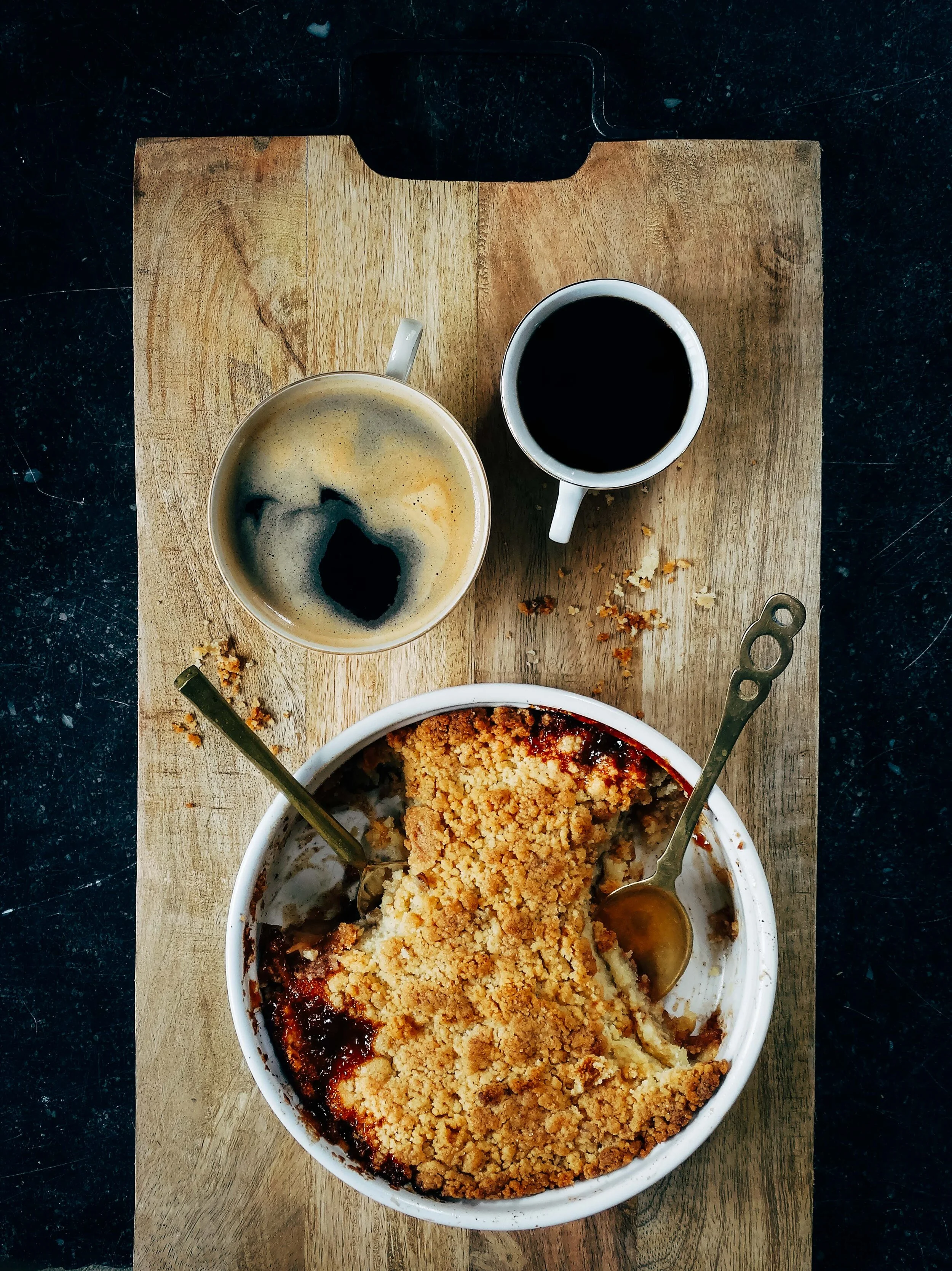 Meng 300 gram bloem met een snuifje zout, 100 gram witte suiker en 50 gram rietsuiker en werk er 200 gram koude boter in blokjes door tot je grove kruimels krijgt. Schil een vijftal appels, snij ze in blokjes, meng met wat kaneel en bruine suiker en bedek er de bodem van een ovenschotel mee.