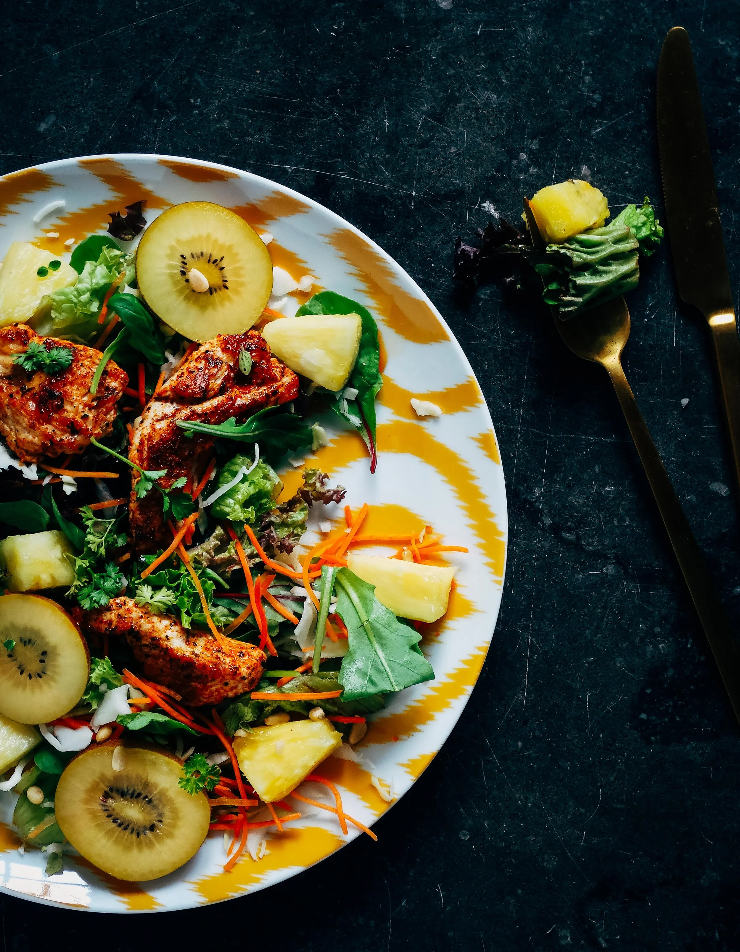 Maak ondertussen de salade. Schil en rasp de wortels, snij de witte kool in fijne sliertjes en was de sla. Drapeer de groenten op een bord. Klop vier eetlepels notenolie met een theelepel mosterd, wat honing en een scheutje citroensap tot een smeuïge dressing. Kruid met peper en zout, en giet de dressing over de groenten. Leg de kipfilets bovenop het slaatje, bestrooi met geroosterde sesamzaadjes en versier het bord met stukjes ananas en kiwi. Serveer de kipsalade met vers brood.
