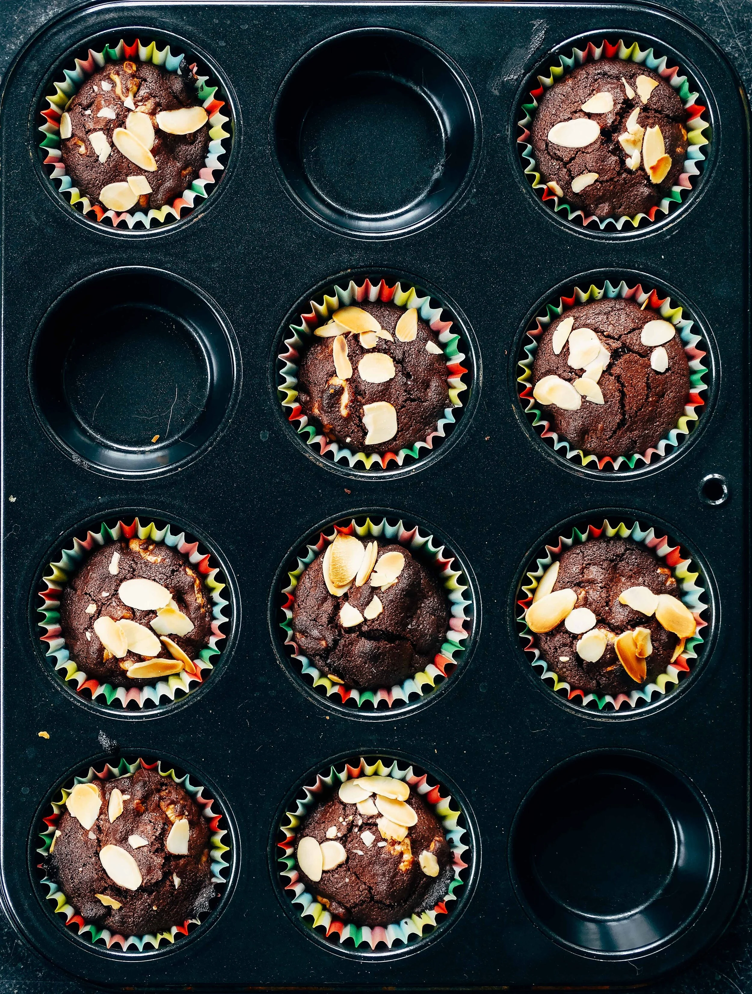 Zet de cakejes 15 à 25 minuten (afhankelijk van de grootte van de vormpjes, ze mogen nog wel wat 'plakken') in de oven op 180°. Laat licht afkoelen.