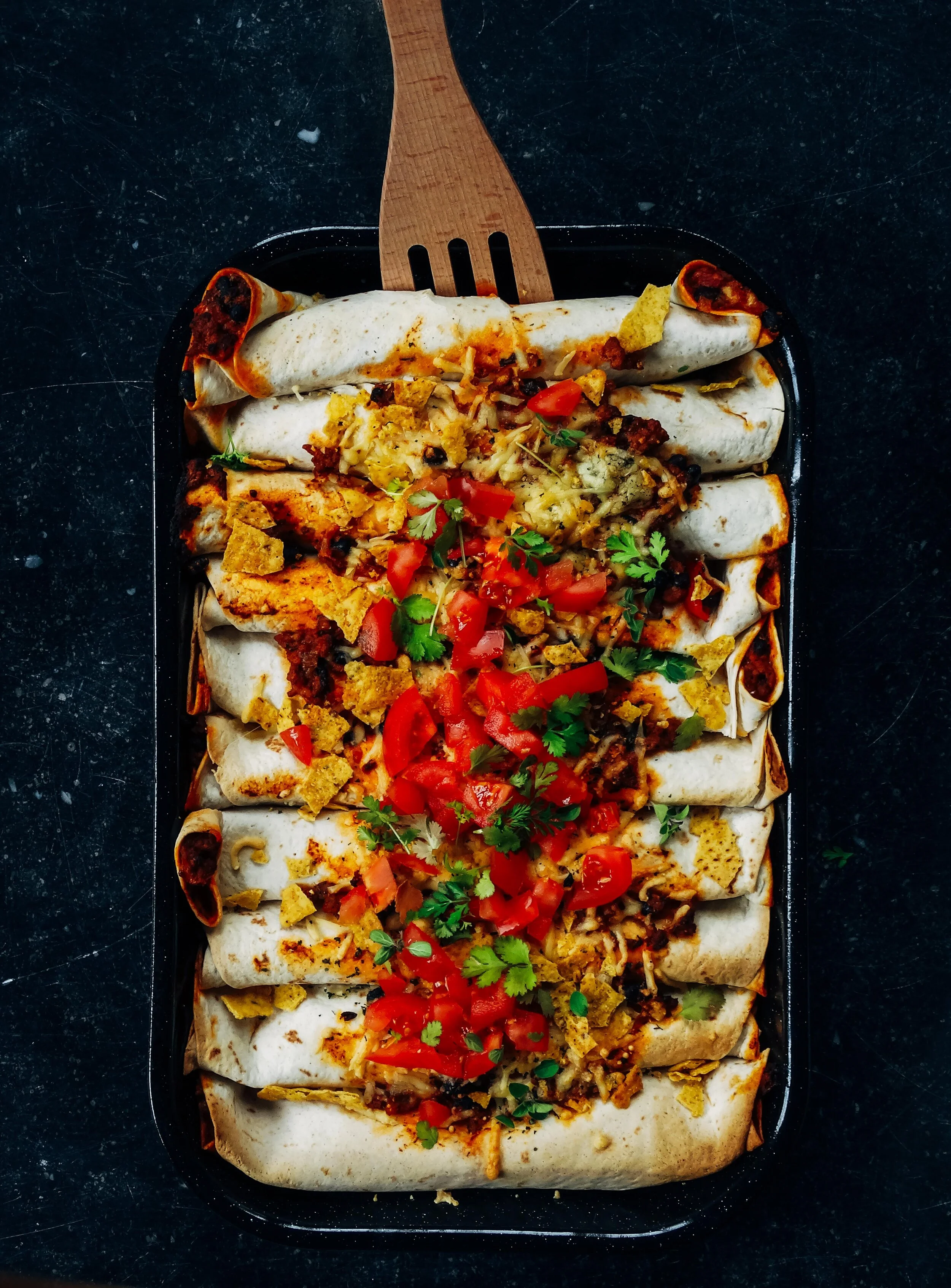 Vet een ovenschotel in. Leg op elke wrap wat van het gehaktmengsel, rol ze strak op en leg ze naast elkaar in de ovenschotel. Bestrooi met geplette tortillachips, geraspte mozzarella en cheddar. Zet de enchilada's kort in de oven op 200° tot de kaas gesmolten is en serveer met een fris slaatje, verse koriander, zure room en avocado.