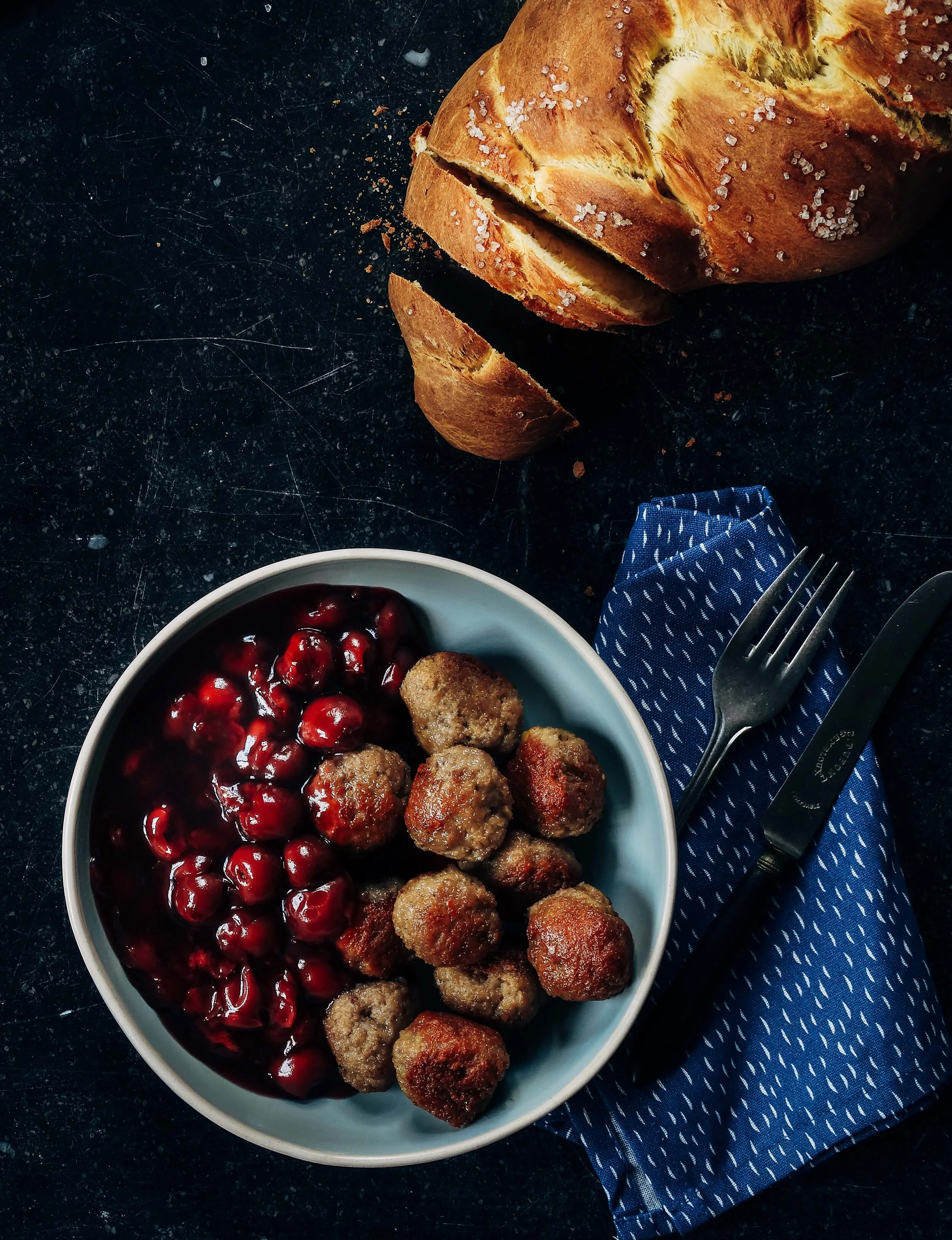 Verwarm in een steelpannetje een bokaal krieken met sap, voeg wat suiker toe en laat indikken met wat witte sausbinder. Serveer de gehaktballetjes met de warme kriekskes en vers witbrood.