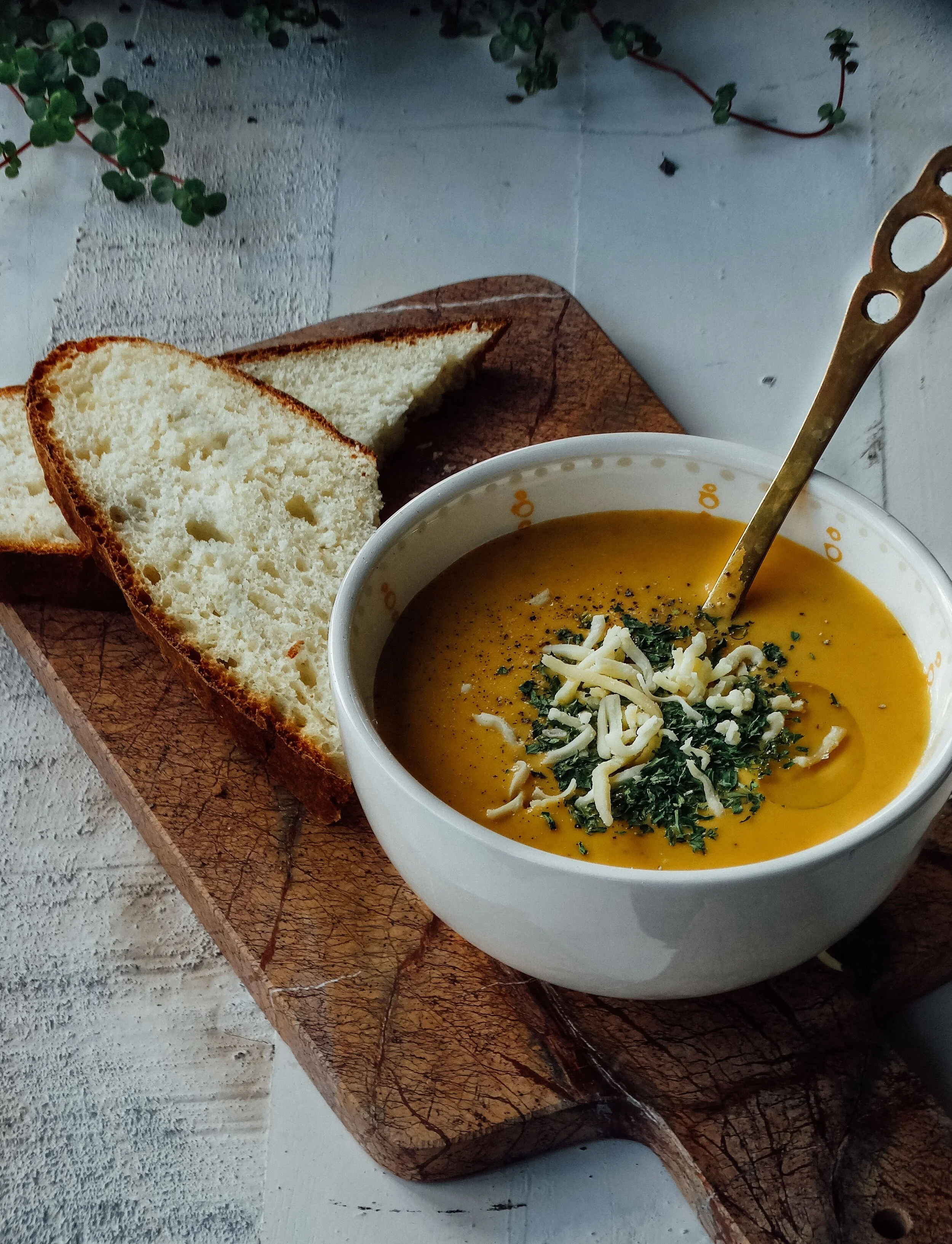 Deze herfstsoep smaakt heerlijk bij toastjes met een plakje geitenkaas op die je eventjes onder de gril legt.