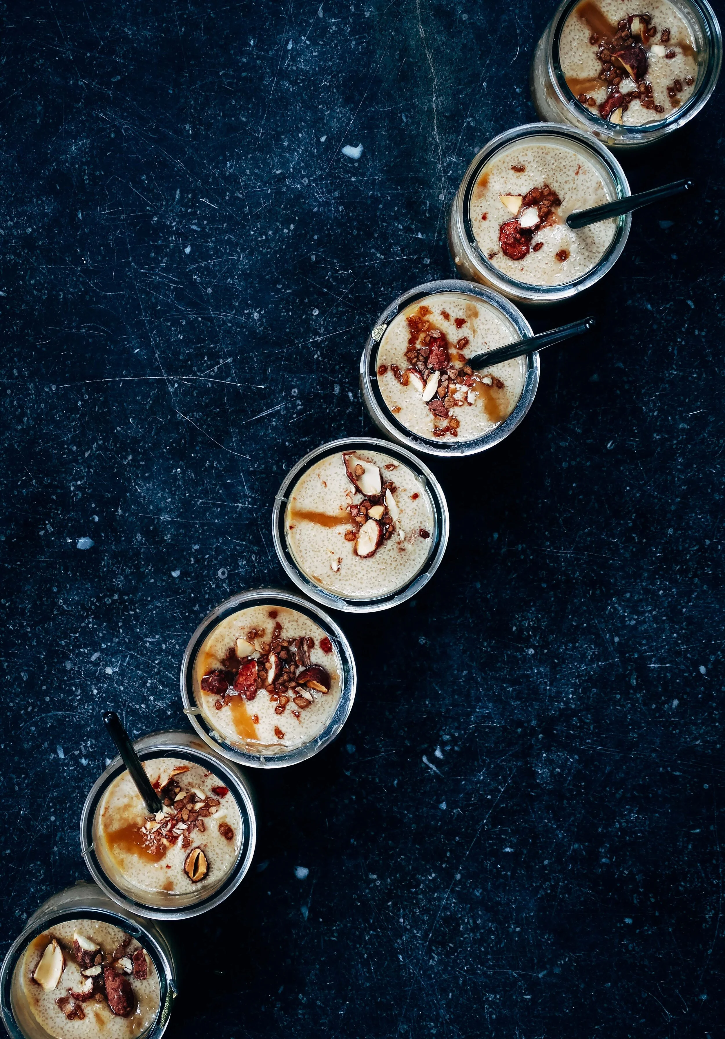 Doe in elk dessertglaasje een lepeltje van de karamelsaus. Vul met de griesmeelpudding en garneer met de rest van de karamel en geroosterde amandelen.