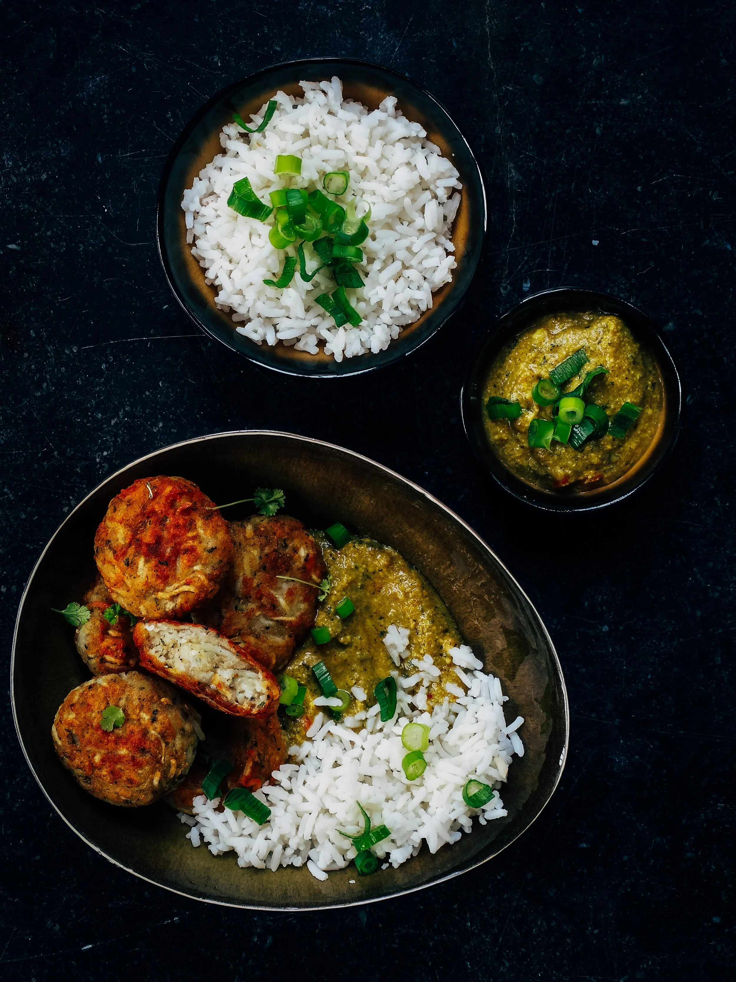 De Indische keuken is wat mij betreft onovertroffen qua lekkere vegetarische gerechten (op de voet gevolgd door de Italiaanse). Dit is een lekker basisrecept voor een veganistische curry met aardappelkoekjes, die je kan aanvullen met je favoriete groenten. Wees niet te zuinig met de kruiden, ze tillen de eenvoudige ingrediënten meteen naar een hoger niveau.