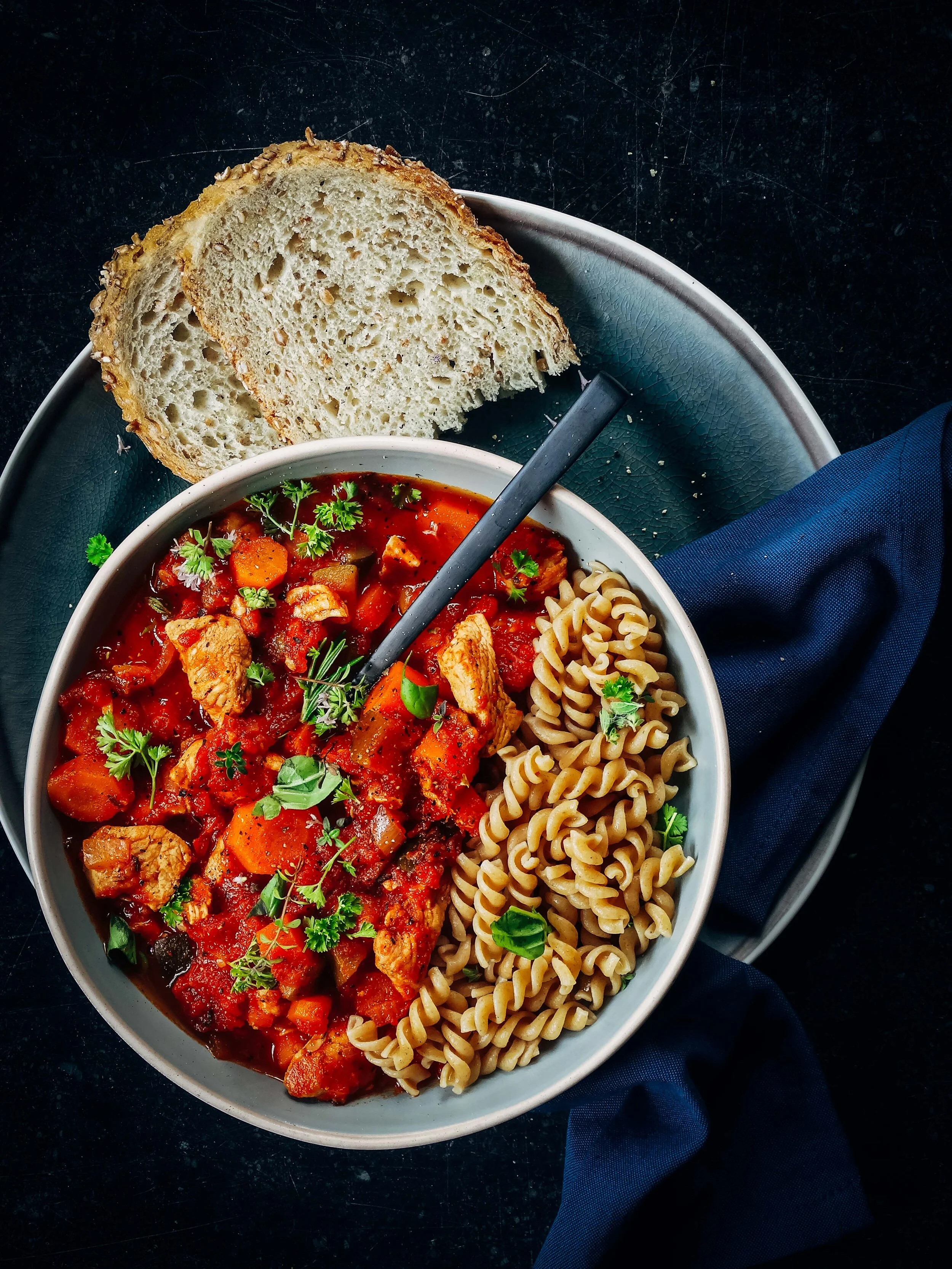Bak in een pot met dikke bodem kleine blokjes kalkoenfilet in een scheutje olie en kruid met tijm, paprikapoeder, peper en zout. Doe er een gesnipperde ui en wat look bij en roerbak deze glazig. Giet er een blik tomatenvlees en een scheut water met wat opgeloste bouillon bij. Voeg als laatste de blokjes courgette en schijfjes wortel toe en breng het geheel aan de kook. Laat zachtjes zo'n 20 minuutjes sudderen tot de groenten beetgaar zijn, en breng op smaak met verse kruiden. Serveer met brood, rijst, pasta of aardappelen.