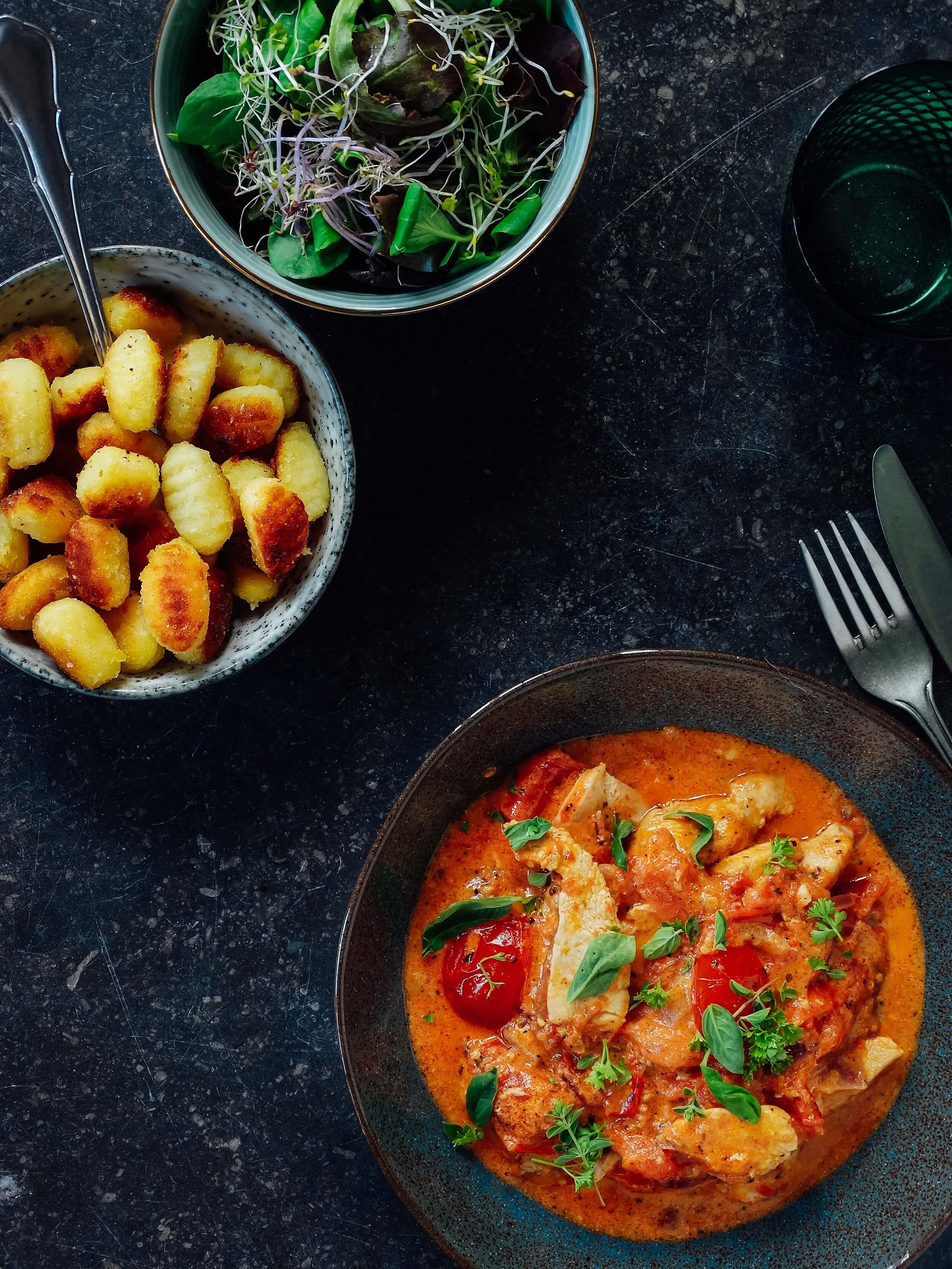 Serveer de kip met pasta of gebakken gnocchi en een groene salade.