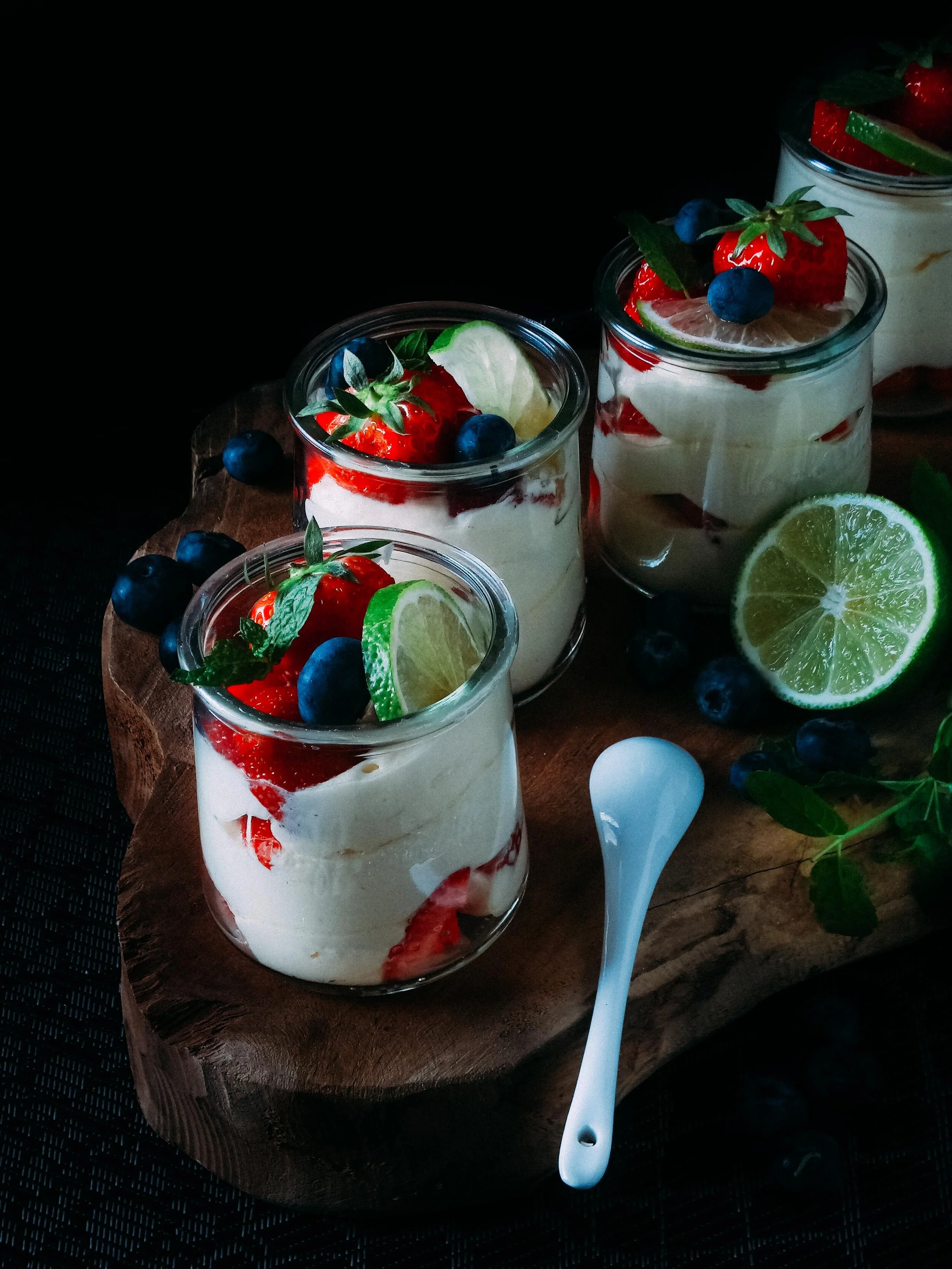 Vul de glaasjes in laagjes met de aardbeien en de mascarponecrème. Laat ze even in de koelkast opstijven en versier met een blaadje munt, een schijfje limoen en blauwe bessen.