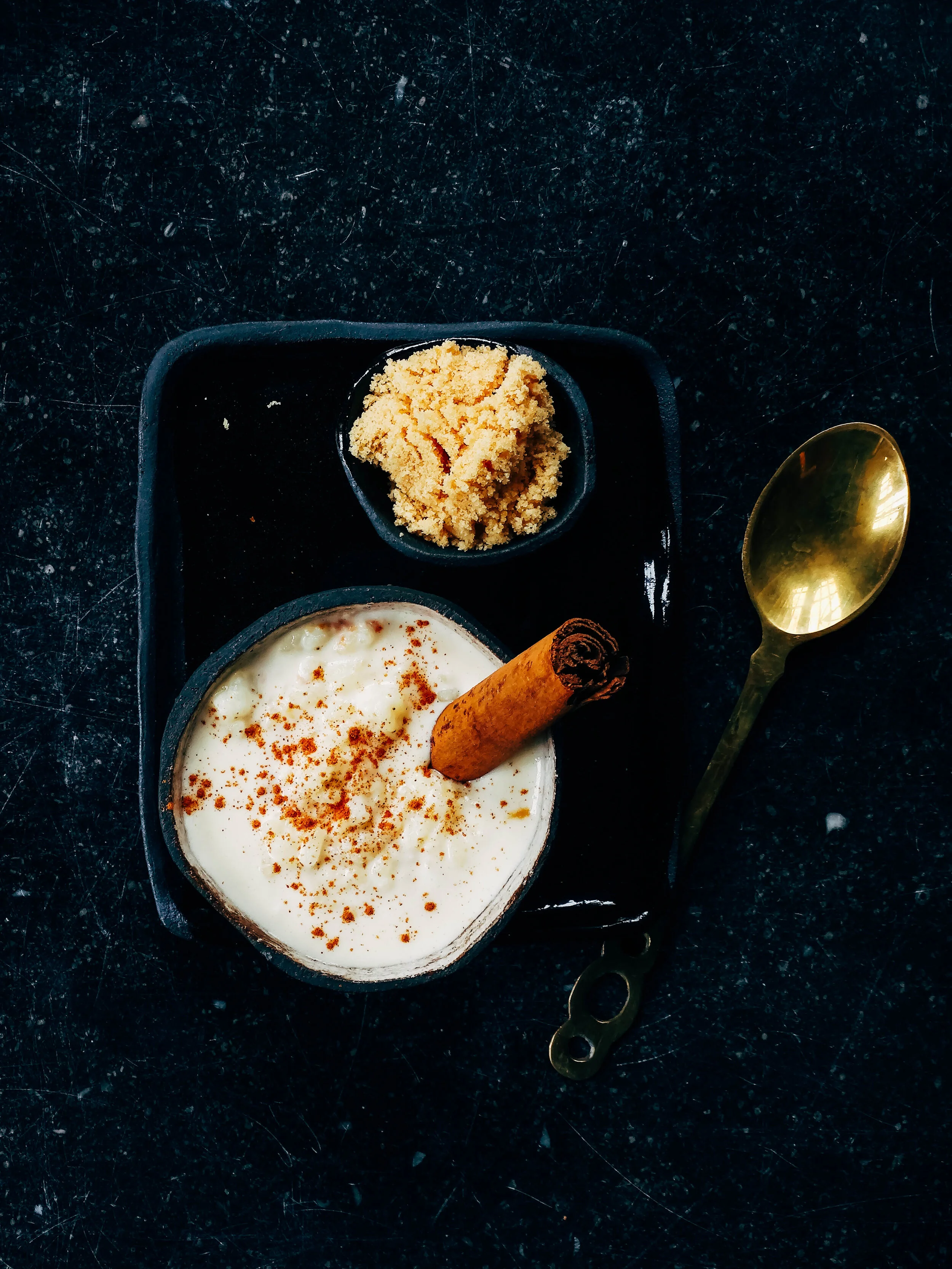 Haal de vanillestokjes uit de melk, schraap het merg eruit en voeg samen met een klein beetje saffraan en/of kaneel toe aan de pap. Draai het vuur uit als de rijst gaar is, laat de pap een beetje afkoelen en meng er een eierdooier en een scheut room onder. Verdeel over kleine potjes, laat verder afkoelen in de koelkast en serveer met bruine suiker. Met deze hoeveelheden heb je voldoende voor 6 personen.