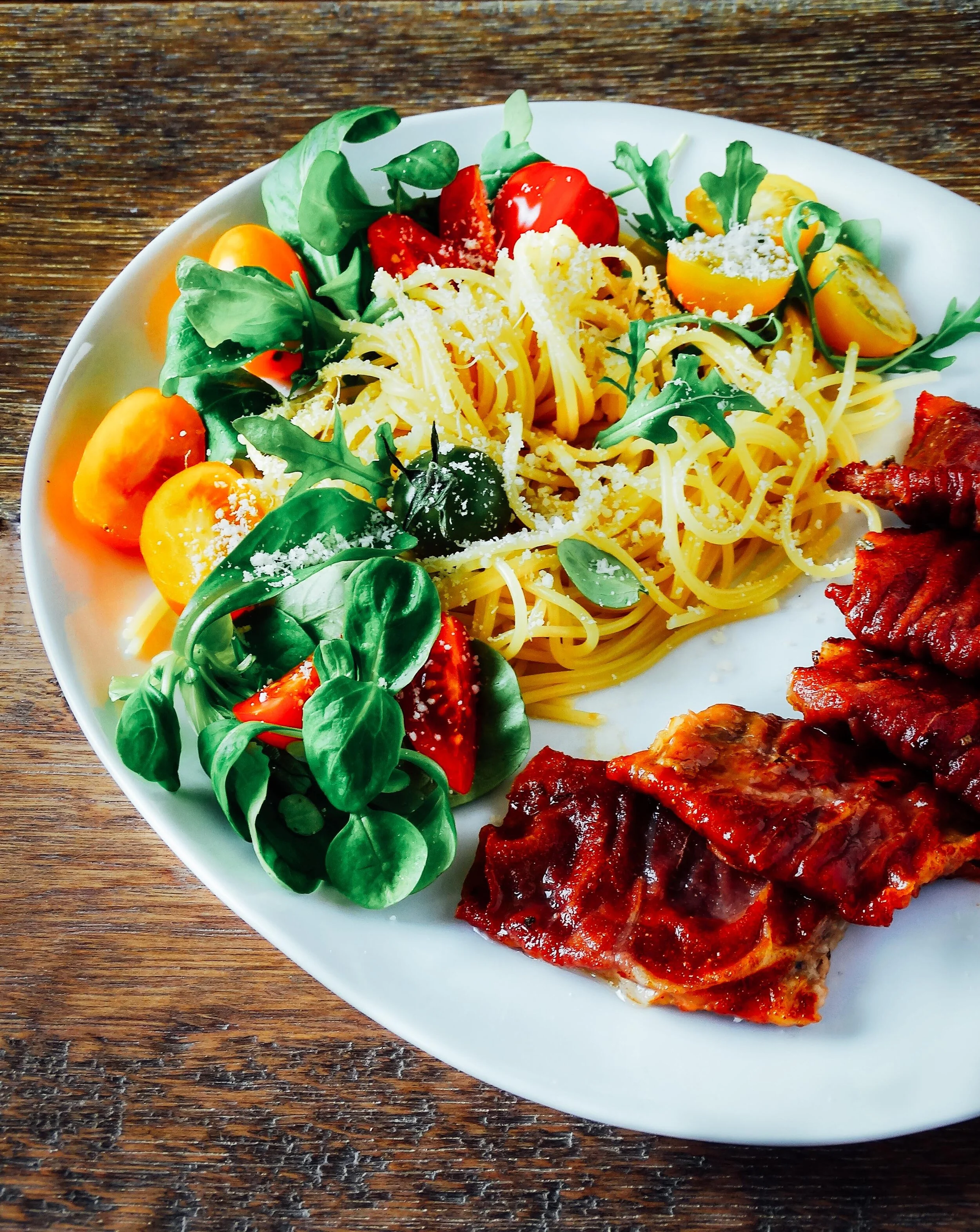 Serveer saltimbocca met pasta en een simpel tomatensausje of gebakken aardappels en een slaatje.