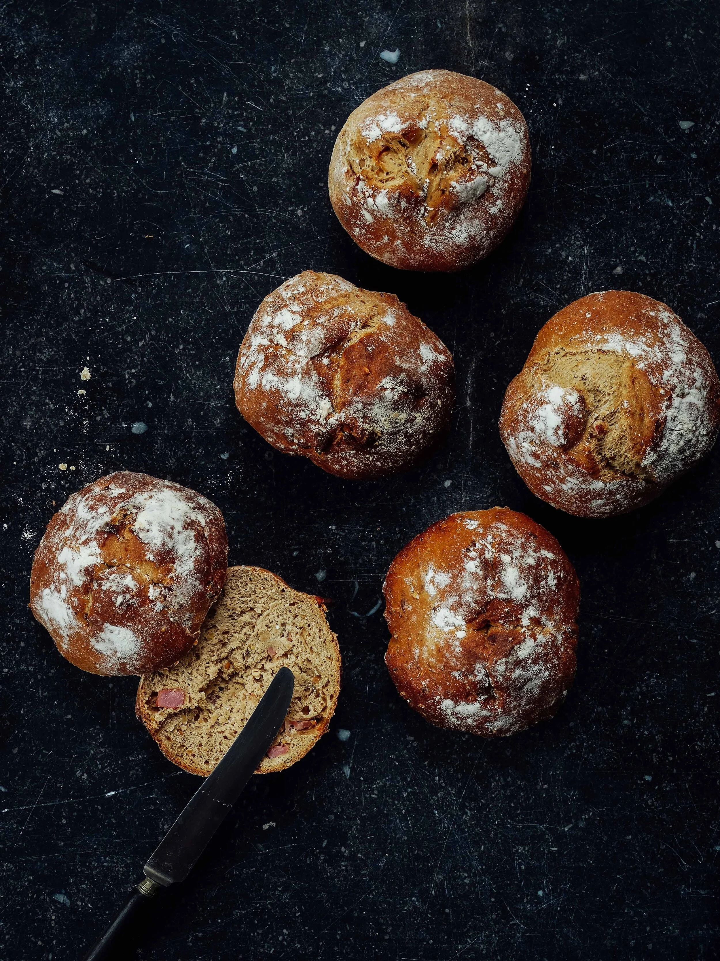 Meestal moet je aan de broodmix enkel water (en soms nog gist en zout) toevoegen volgens de aanwijzingen op de verpakking. Terwijl het brood aan de eerste rijzing bezig is, bak je de spekjes krokant in een pan. Laat ze enigszins afkoelen en kneed ze onder het gerezen deeg. Vorm bolletjes van het deeg en laat ze nog een uur onder een theedoek rijzen.