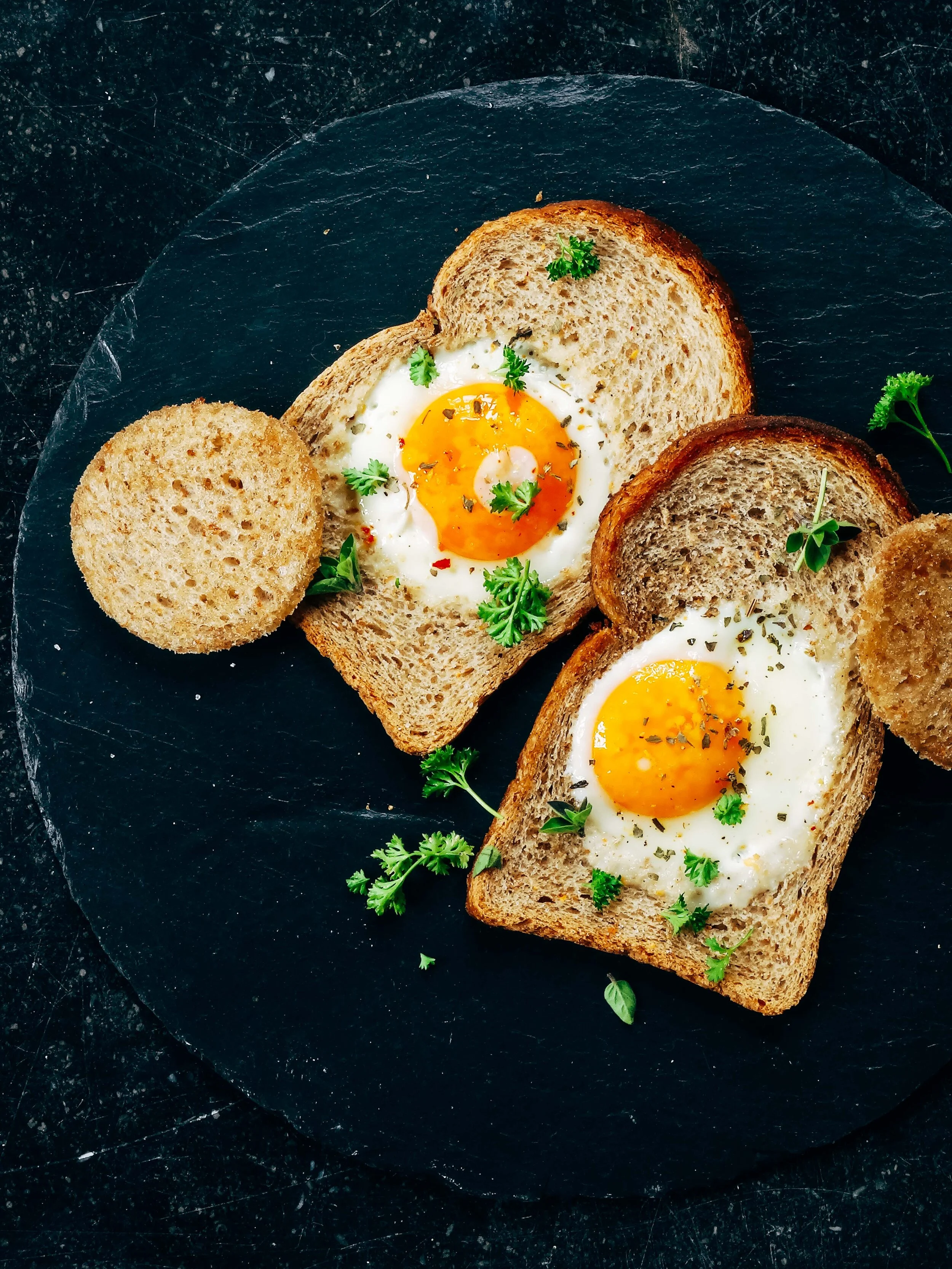 Steek met behulp van een glas of kookring een ronde uit een snee brood. Smelt wat boter in een pan, leg de boterham erin en breek een ei boven het gat in de boterham. Kruid de toast met peper, zout & peterselie en laat verder stollen in de pan op een lager vuur. Bak het uitgestoken rondje ook mee, dat kan je gebruiken om te soppen.