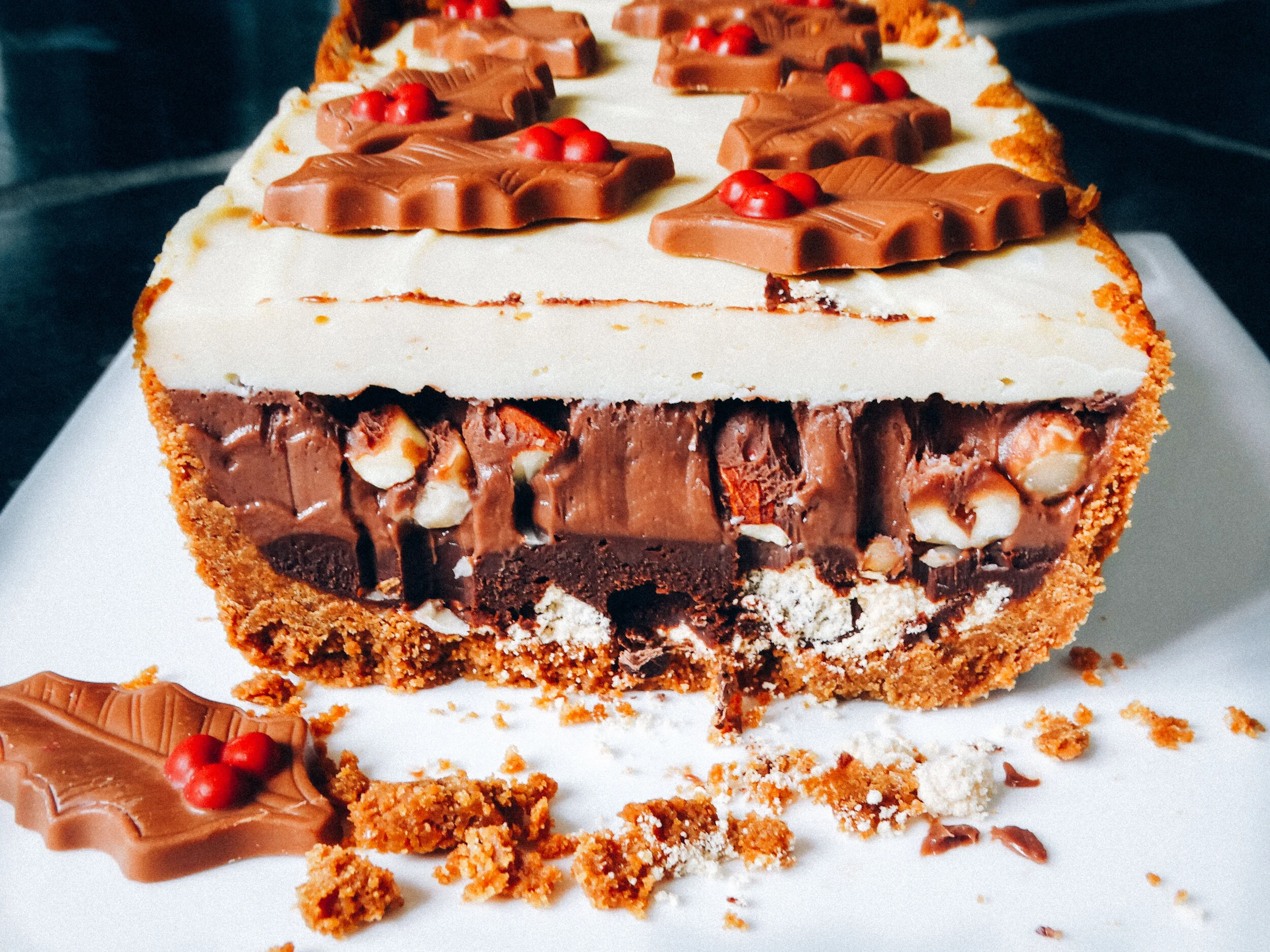 Bekleed een cakevorm met aluminiumfolie. Maal 250 gram speculaasjes of andere koekjes fijn en meng met 125 gram gesmolten boter. Bekleed de volledige vorm met het speculaasmengsel, druk goed aan en zet in de koelkast. Maak vervolgens de drie ganachelagen, die je telkens laag per laag lichtjes laat opstijven in de koelkast alvorens de volgende laag er op te gieten.