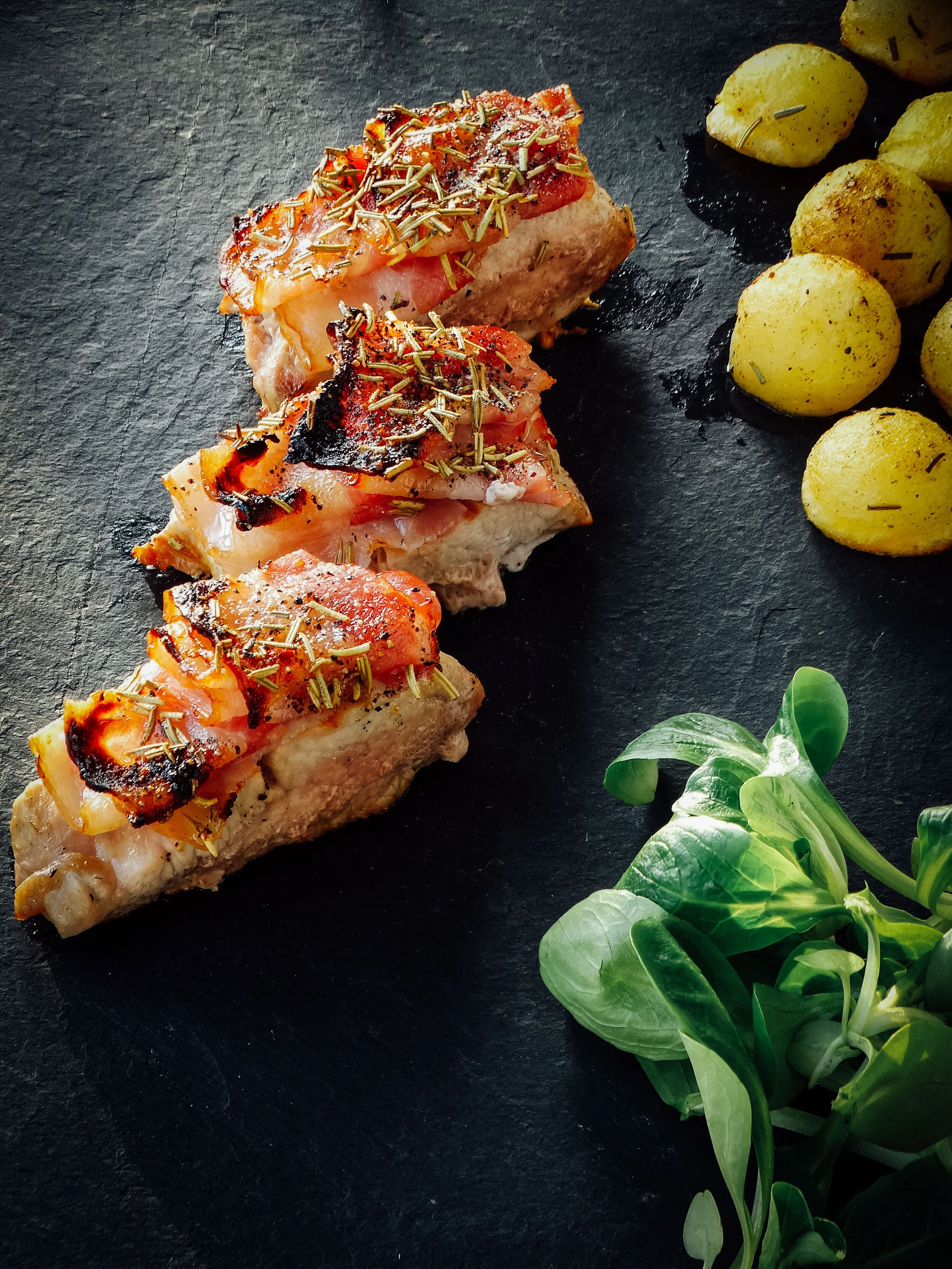 Snij de varkenshaas in nootjes van 4-5 cm, en bak aan alle zijden even aan in wat boter of olie. Kruid met peper en zout. Schik ze in een ovenschaal, leg op elk stukje vlees een geplooid dun sneetje spek en bestrooi met rozemarijn en vloeibare honing. Zet 15 à 20 minuten in de oven op 200°, tot het vlees gaar is maar nog een beetje roze ziet.