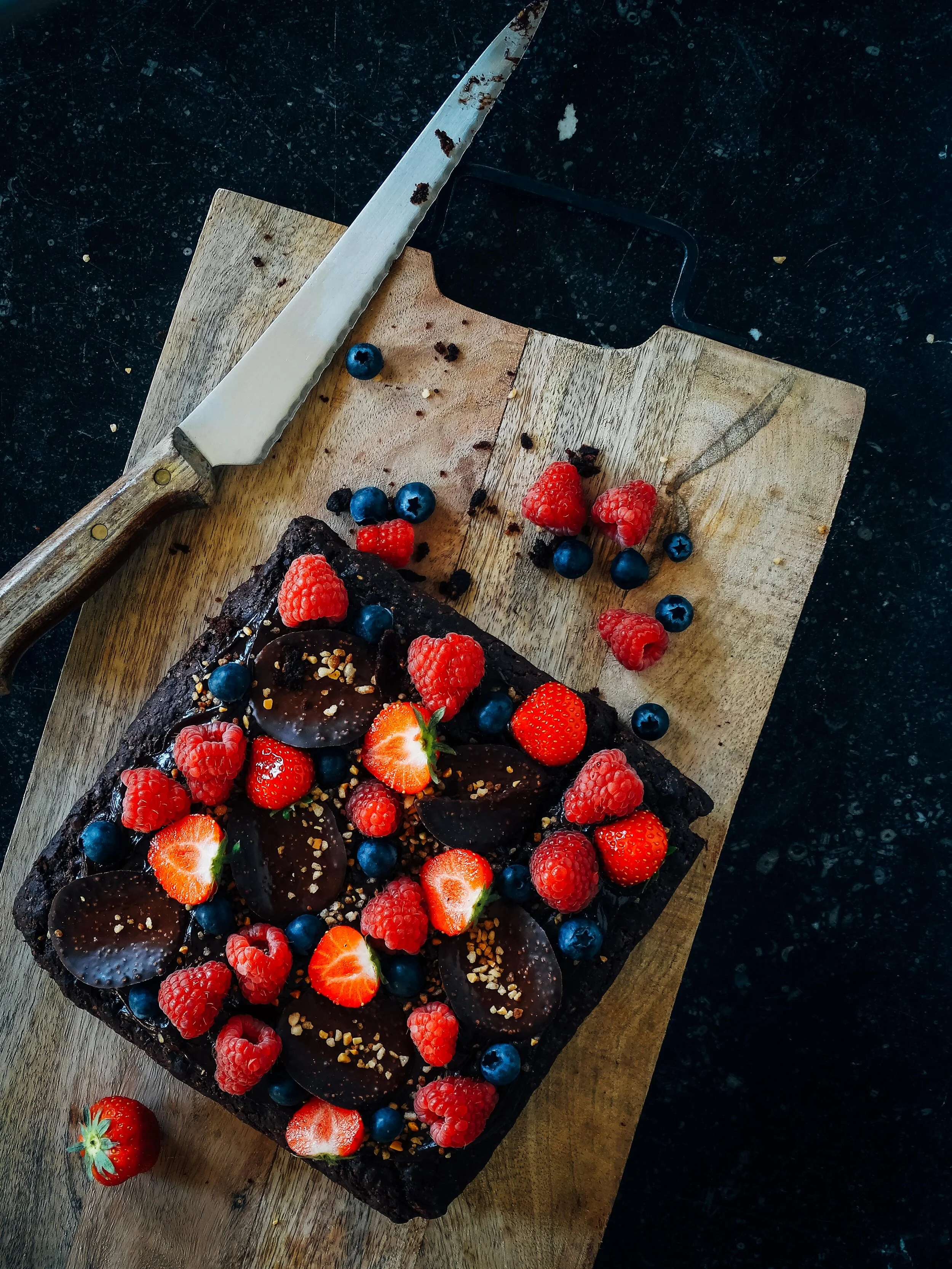 Hak 100 gram pure chocolade fijn en breng 100 ml kokosmelk tegen de kook aan. Giet de kokosmelk over de pure chocolade in een kom, laat even staan en roer tot een gladde ganache. Smeer de ganache op de chocoladecake en decoreer met rood fruit.