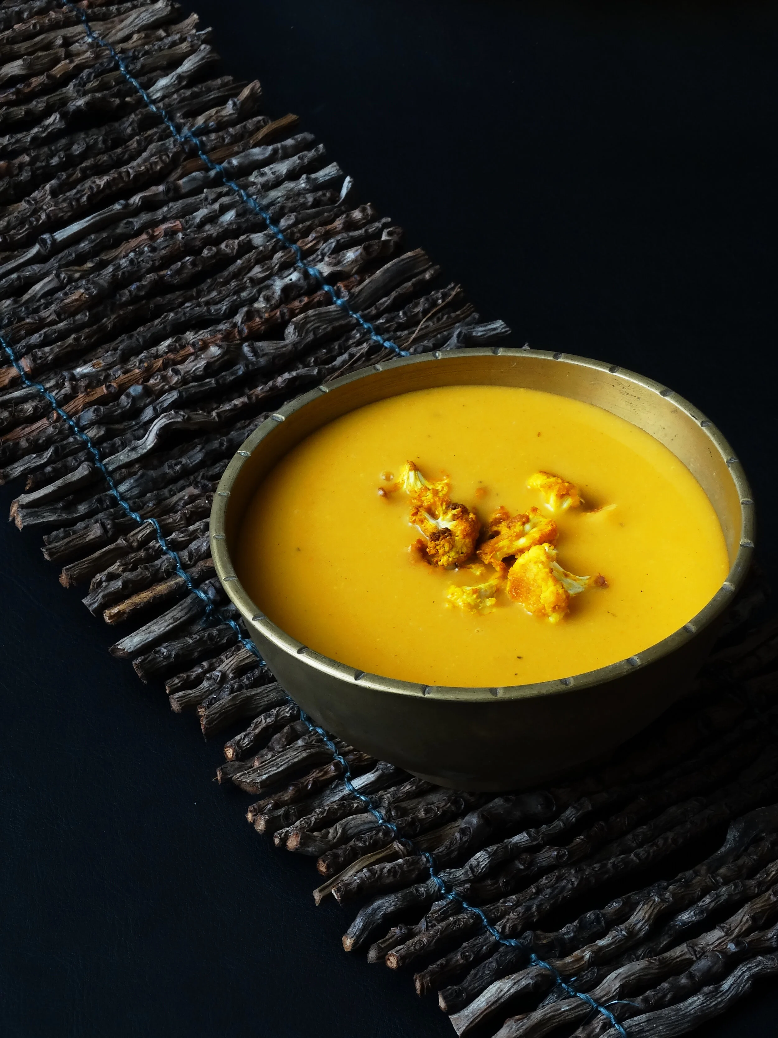 Serveer de soep met de geroosterde bloemkoolroosjes, verse peterselie en een scheutje kokosmelk.