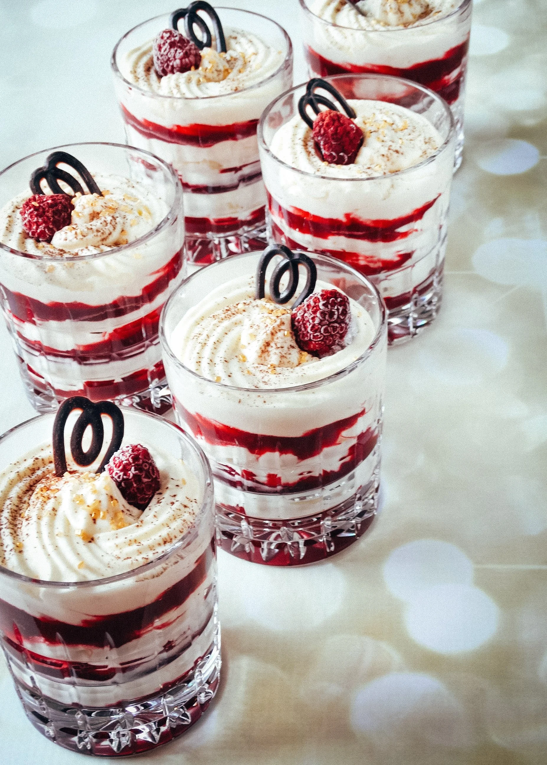 Verwarm ondertussen een zak diepvriesframbozen in een pannetje met 3 grote scheppen suiker. Als de vruchten ontdooid zijn en de suiker opgelost is, kan je het fijn pureren tot een gladde frambozencoulis in een pannetje. Laat de coulis terug afkoelen. Maak afwisselend laagjes chocolademousse en coulis in mooie glaasjes en laat verder opstijven in de koelkast. Deze hoeveelheden zijn voldoende voor 6 à 8 potjes.