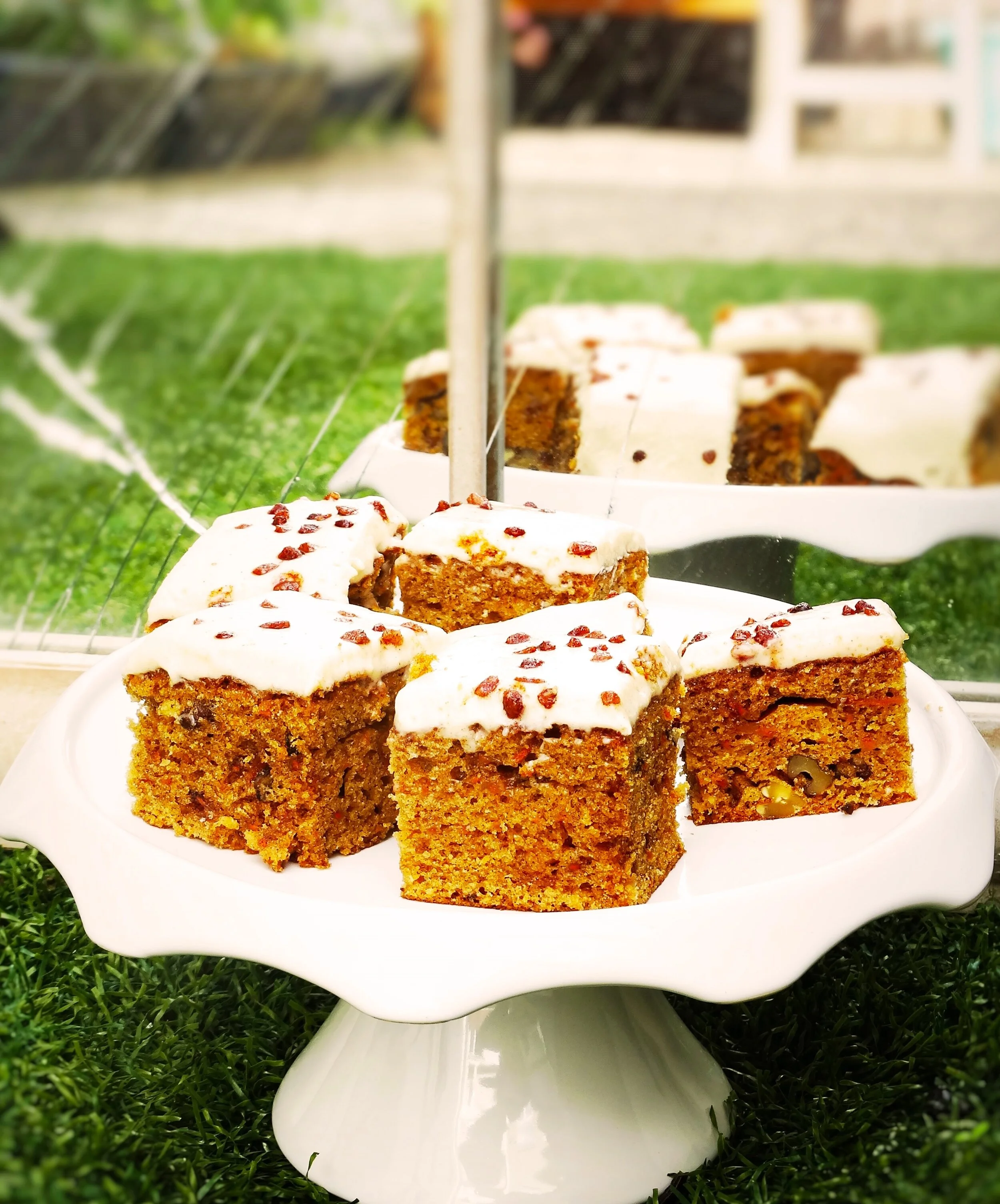 Klop 175 gram lichtbruine suiker met 150 ml zonnebloemolie tot de suiker volledig opgenomen is. Voeg al kloppend 3 eieren, 1 eetlepel appelsienzeste, 1 eetlepel appelsiensap, 175 gram zelfrijzende bloem, 2 theelepels kaneel of koekkruiden, een snuif zout en nootmuskaat en 1 theelepel baking soda toe. Rasp 200 gram wortelen en hak 100 gram walnoten fijn. Spatel ze onder het beslag en doe dit in een ingevette bakvorm. Je kan ook rozijnen toevoegen. Zet de worteltaart 25 minuten in de oven op 180°, of tot een breinaald er droog uitkomt.