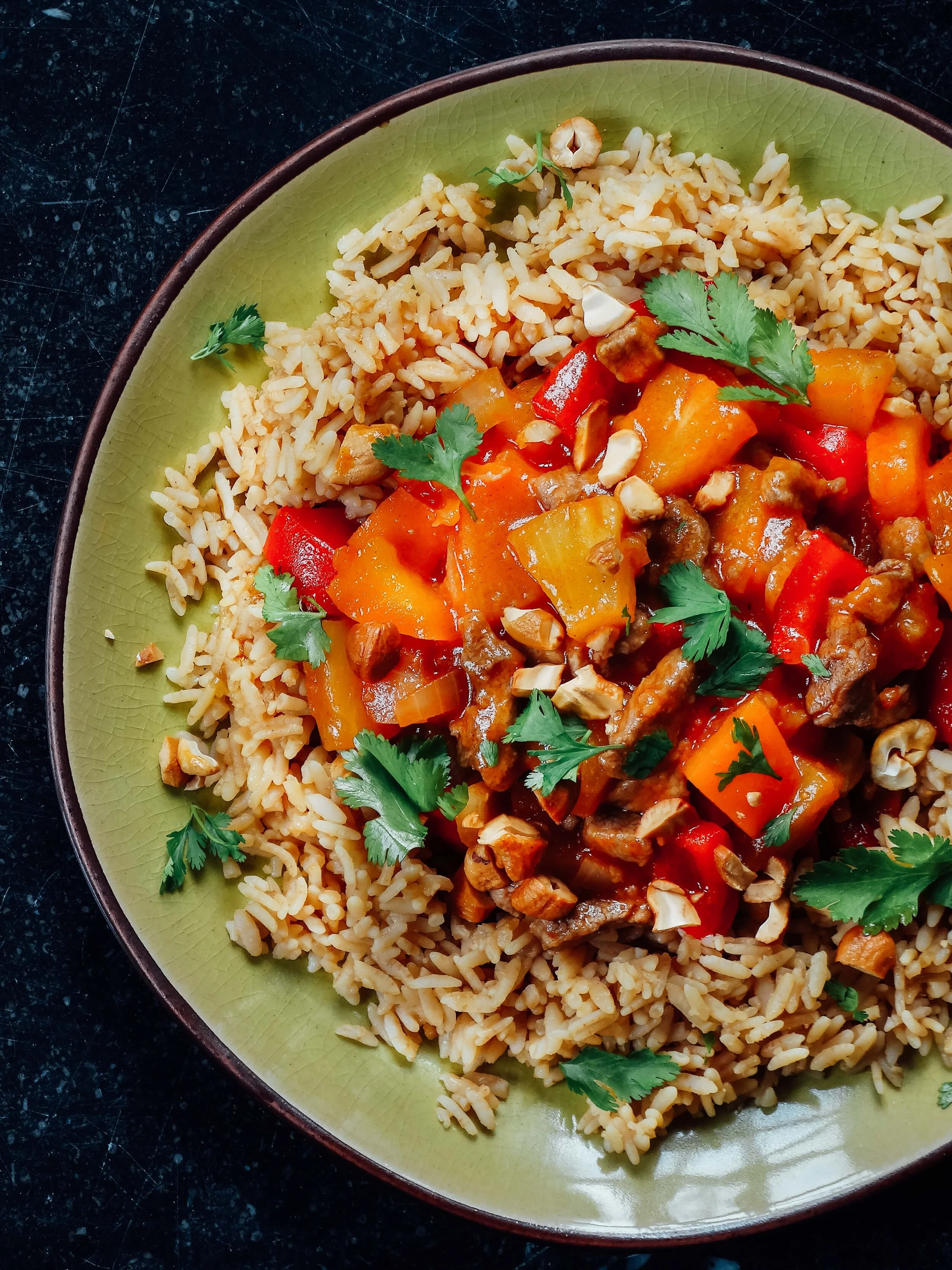 Blus met het ananassap, een scheutje wijnazijn en meng er een lepel tomatenpuree onder. Leng aan met wat water, voeg een half bouillonblokje toe en laat op een zacht vuurtje wat indikken. Voeg het vlees terug toe. Breng de saus indien nodig verder op smaak met peper, zout en suiker en serveer met rijst.