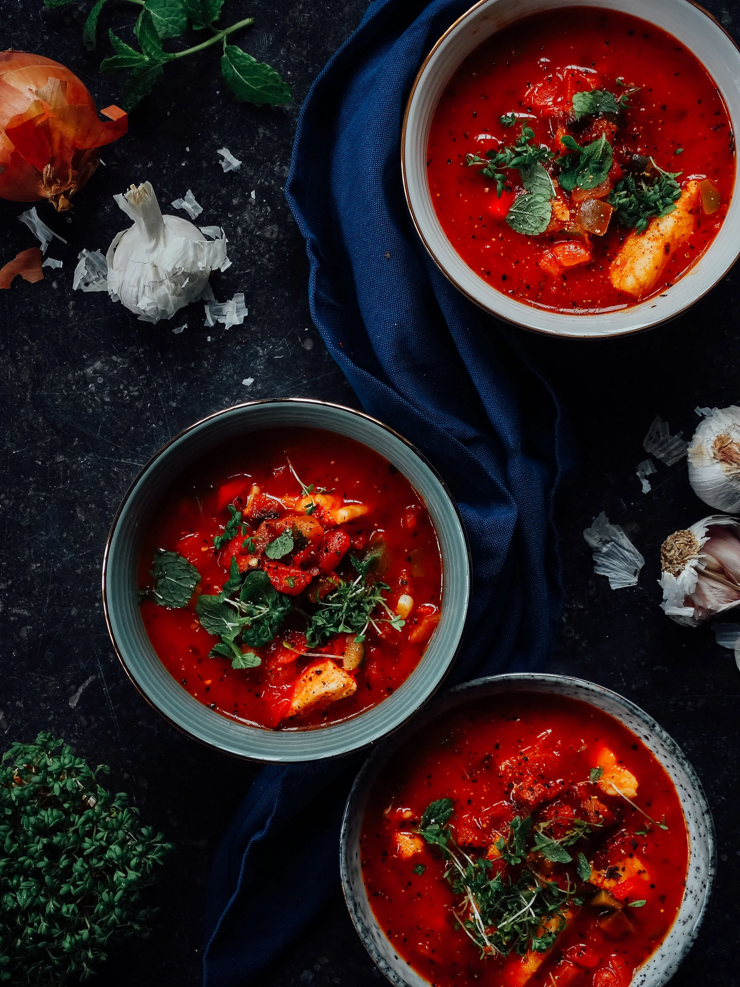 Snij een courgette, aubergine, paprika en tomaat in kleine dobbelsteentjes. Snipper een ui en een teentje look fijn. Stoof ze in wat olijfolie en voeg de andere groenten toe. Roer er een lepel tomatenconcentraat onder en giet groenten- of visbouillon bij de soep tot deze de gewenste dikte heeft.